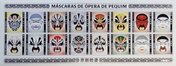 1.几内亚比绍《京剧脸谱》套票版张(16枚合计面值11200FCFA)。16枚邮票分别表现了李元霸(四平山)、董卓(凤仪亭)、魏延(战长沙)、项羽(霸王别姬)等16出京剧中的人物脸谱。