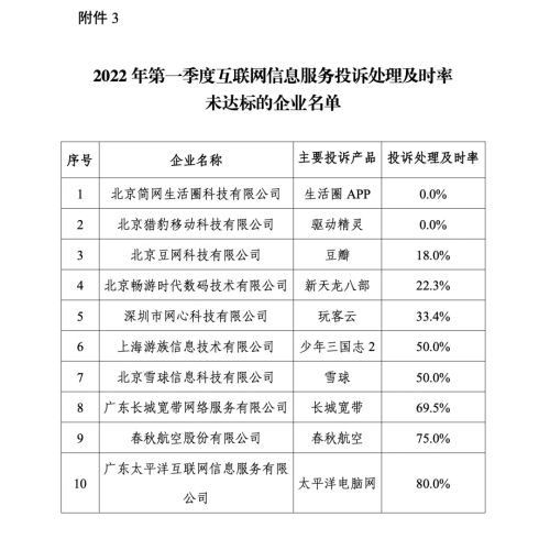 3. 2022年第一季度互联网信息服务投诉处理及时率未达标的企业名单
