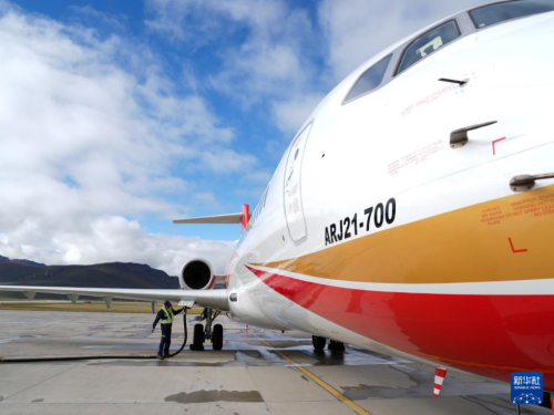 在青海果洛玛沁机场,工作人员在为国产商用飞机ARJ21加油(图片来源:新华社)