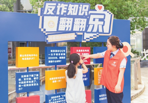 近日,中国电信安徽黄山分公司“爱心翼站”联合黄山市反电诈中心开展以“警惕诈骗新手段,不做电诈工具人”为主题的反诈集市活动,旨在增强未成年人、老年人等特殊群体的防诈“免疫力”。活动通过“反诈知识翻翻乐”“反诈视力表”等趣味游戏,让群众在欢声笑语中学习反诈知识、了解新型诈骗手段,提升防骗应对能力。图为“爱心翼站”志愿者与参加活动的小朋友进行“反诈知识翻翻乐”游戏。