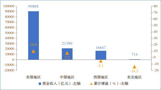 1—10月,规模以上电子信息制造业东部地区实现营业收入90888亿元,同比增长10%,较1—9月回落0.2个百分点;中部地区实现营业收入21390亿元,同比增长7.1%,较1—9月回落1.5个百分点;西部地区实现营业收入16647亿元,同比下降5.1%,较1—9月提高0.3个百分点;东北地区实现营业收入714.4亿元,同比下降14.3%,较1—9月提高0.1个百分点。10月份,东部地区实现营业收入10174亿元,同比增长8.5%,中部地区实现营业收入2784亿元,同比下降1.7%;西部地区实现营业收入1750亿元,同比下降2.7%;东北地区实现营业收入66.2亿元,同比下降13%。