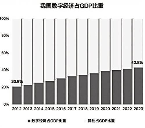 2023年,我国数字经济规模达到53.9万亿元,数字经济占GDP比重达到42.8%,数字经济同比名义增长7.39%,高于同期GDP名义增速2.76个百分点,数字经济增长对GDP增长的贡献率达66.45%……