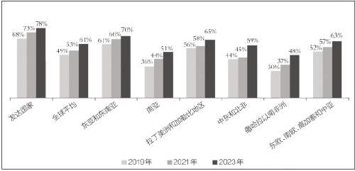 2019年、2021年和2023年全球各地区的贸易数字化指数