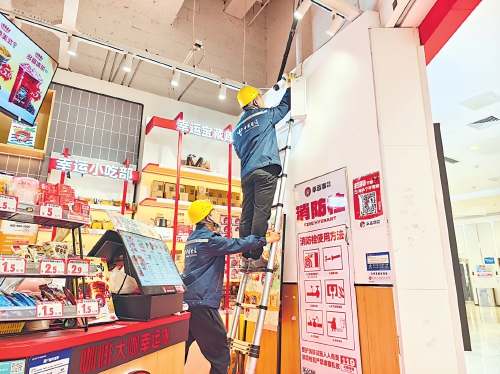 近日,中国电信河北保定分公司携手市场监督管理局打造“互联网+明厨亮灶”项目,助力餐饮行业数字化转型,实现美食从制作到上桌的全过程监控,为广大消费者筑起一道坚实的食品安全防线。图为该公司智企工程师许盼和同事在保定市万达广场未来石店安装天翼云眼摄像头。