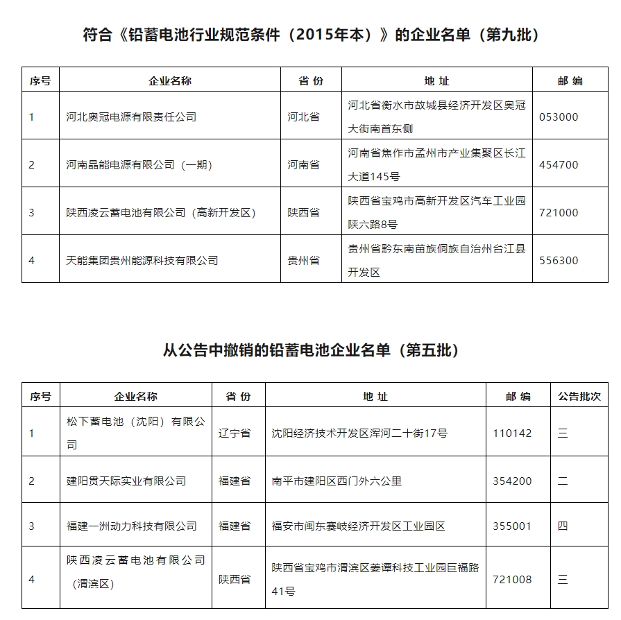 为推动我国铅蓄电池行业持续、健康、协调发展,依据《铅蓄电池行业规范条件(2015年本)》(以下简称《规范条件》)和《铅蓄电池行业公告管理办法(2015年本)》,经专家核实、网上公示等程序,现将符合《规范条件》企业名单(第九批)、从公告中撤销的企业名单(第五批)、符合《规范条件》企业信息变更名单(第四批)予以公告。