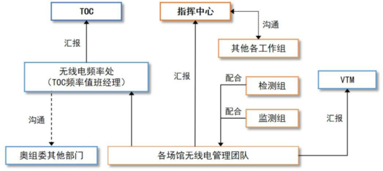 (1)北京赛区:无线电频率管理主管向场馆技术经理(VTM)、TOC 和指挥中心汇报(简称“三线汇报”)。